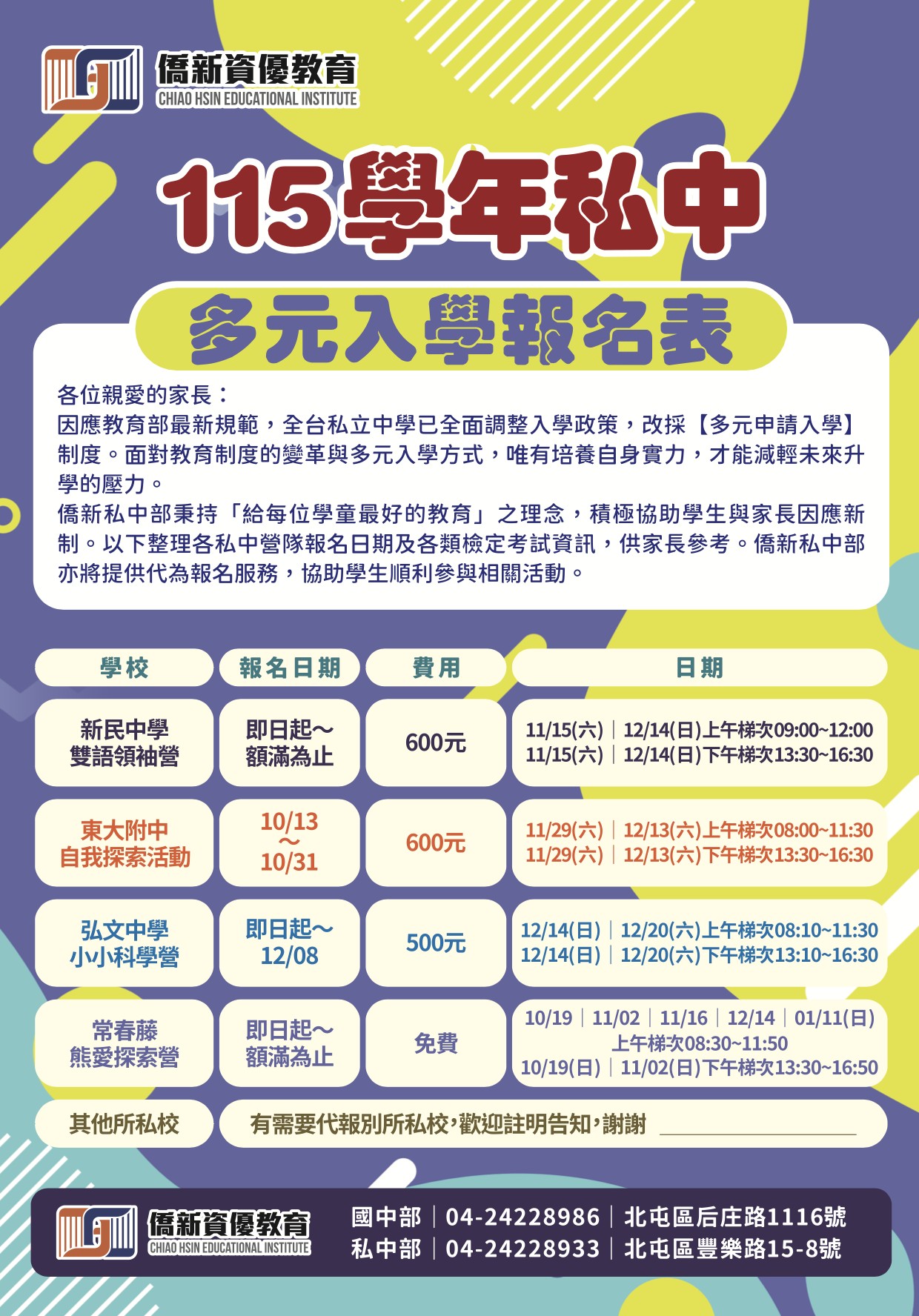 僑新私中部秉持「給每位學童最好的教育」之理念,積極協助學生與家長因應新制。以下整理各私中營隊報名日期及各類檢定考試資訊,供家長參考。僑新私中部亦將提供代為報名服務,協助學生順利參與相關活動。